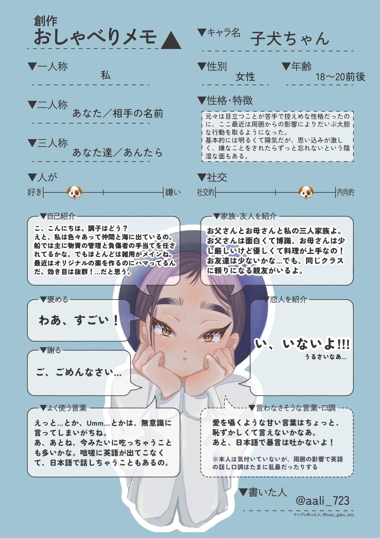 子犬ちゃんは、私が描いていて楽しくなるよう、私の好みをモリモリに盛り込んだキャラクターなので、ちょっと癖が強く出ているかと思います。なので、私が描く子犬ちゃんの姿と、皆さんが想像する長編夢主の姿は、もしかしたら全くの別人かもしれませんね。それでも、どうかお気に留められませんように。全然問題ありません!「みんなちがって、みんないい」の精神です。むしろ、皆さんが想像する長編夢主の姿も見てみたいです!ぜひお聞かせください!